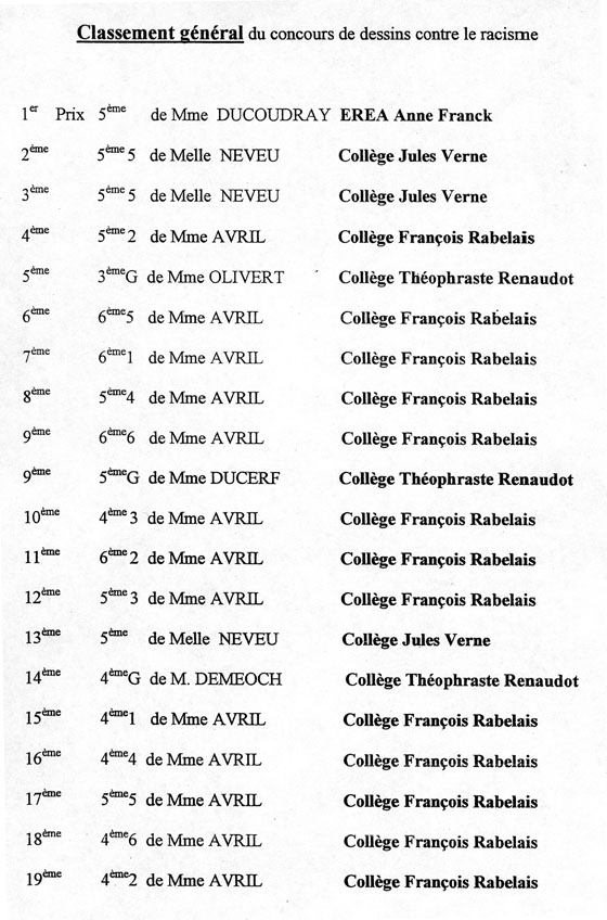 P.S. Ci dessous le classement qui nous a été envoyé dernièrement ( et reçu mardi 15 / 05 ) par la mairie de Poitiers accompagné d'une lettre de remerciements et de félicitations aux jeunes.