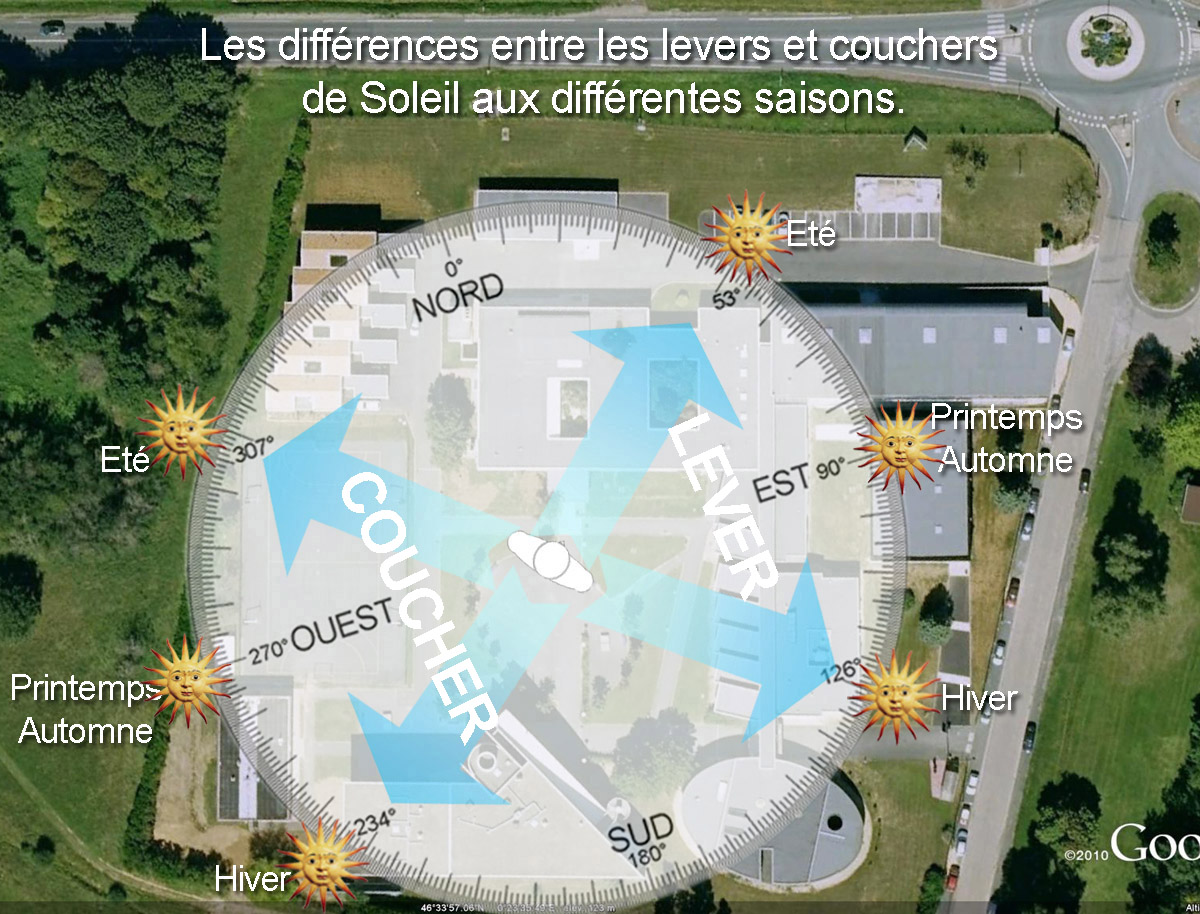 Notez que le Soleil se lève à l'Est (à l'horizon vrai) le jour du printemps (et de l'automne). Puis il monte en diagonale vers le Sud (à droite).