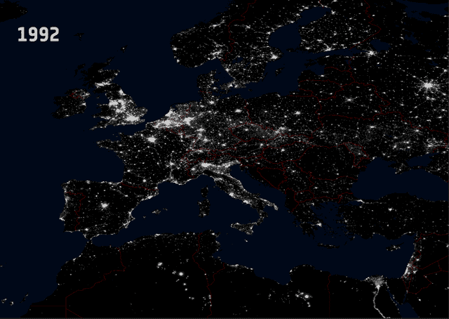 Mais le plus étonnant dans la carte animée visible ci-dessous est que les pays développés d'Europe - dont la population évolue peu - voient eux aussi augmenter sensiblement leur pollution lumineuse. On pourrait pourtant penser qu'en 1992, ils étaient déjà à saturation d'éclairage !