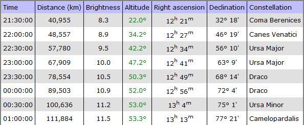 Vitesse de déplacement : le début de la nuit sera le moment ou 212 DA 14 passera au plus près de la Terre. A 21h, il semblera alors se déplacer très vite : il parcourra chaque minute une distance comparable à la taille apparente de la Lune puis il semblera ralentir à mesure qu'il s'éloignera de la Terre : entre 22 et 23h, il semblera se déplacer 2 fois moins vite, et 4 fois moins vite entre 23h et minuit.